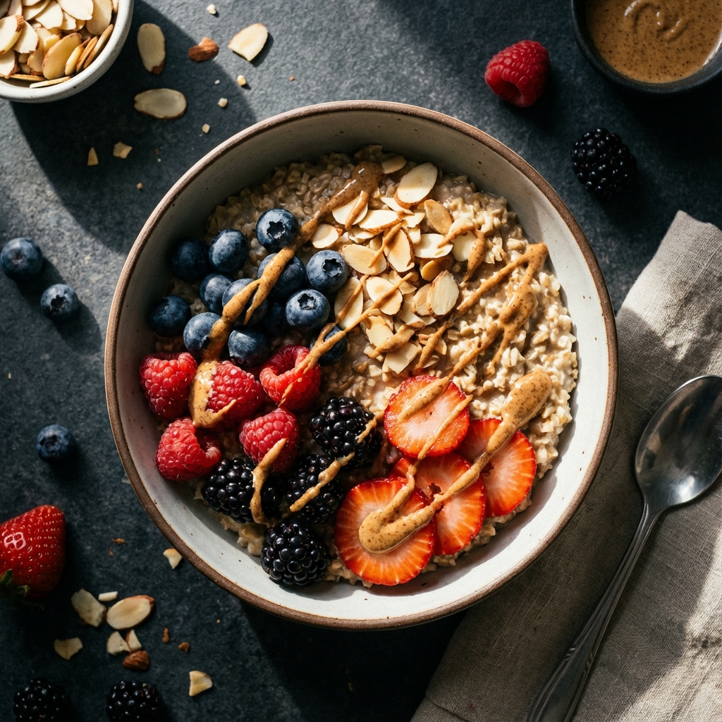 Bowl de avena proteica con frutos rojos y crema de almendras.