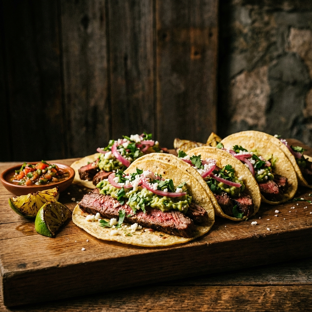 Tacos de solomillo con tortillas de maíz y guacamole casero.